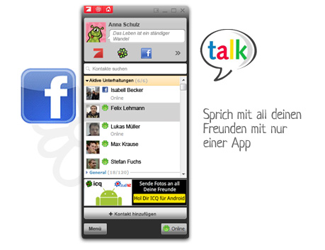 Du kannst bekannte Soziale Netzwerke wie Facebook, Odnoklassniki, Vkontakte, sowie Messenger wie Google Talk, Mail.Ru Agent und weitere verbinden. Wenn Du Dein Konto mit ICQ verbindest, werden all Deine Freunde des Sozialen Netzwerks oder Messengers in Deiner ICQ Kontaktliste erscheinen.