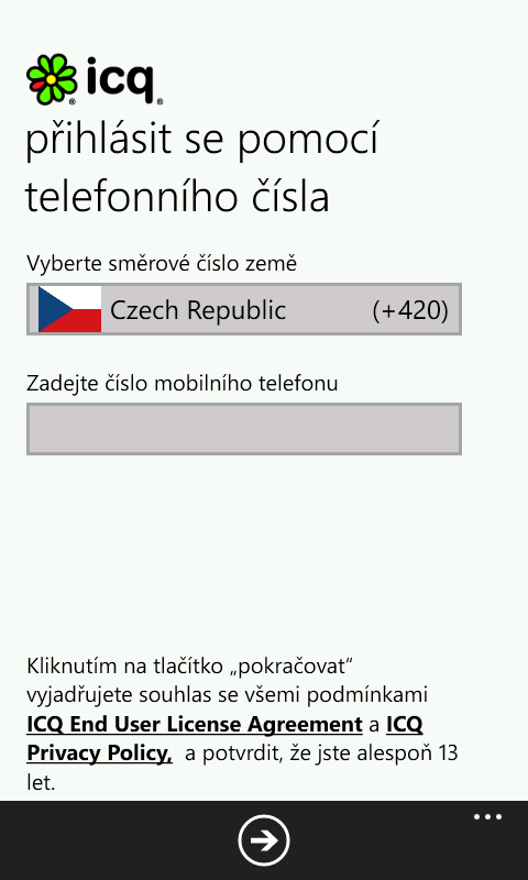 Začněte používat ICQ Mobile bez starostí s registrací UIN – je to rychlé a snadné. Pro přihlášení stačí zadat vaše telefonní číslo a aktivační kód, který obdržíte v SMS.