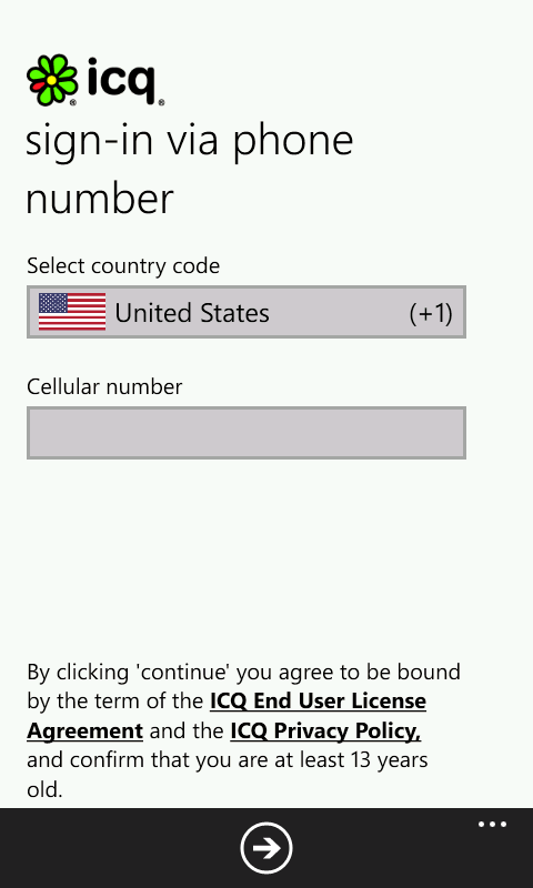 Start using ICQ Mobile without UIN registration – it’s easy and fast. To login to ICQ simply type in your phone number and enter the activation code sent to you via SMS.