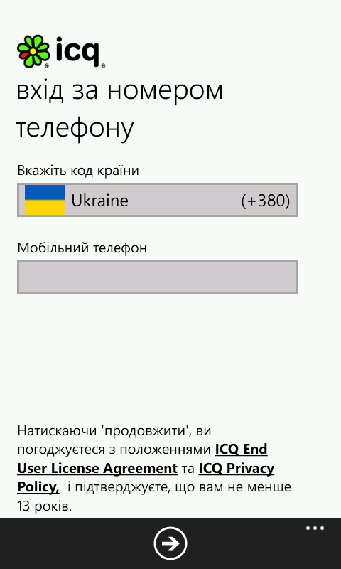Введіть номер вашого мобільного телефону, щоб отримати посилання для встановлення ICQ