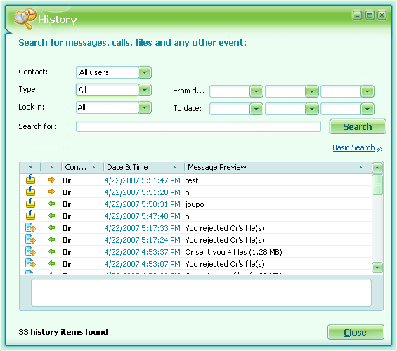 Advanced Search link to display the advanced search panel enabling you to search for a specific type of message or activity(SMS, Phone message, file transfer etc.) or search a defined time range.