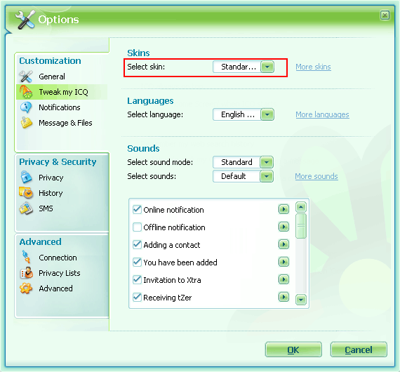 You can change your ICQ skin to any one of the offered skins.