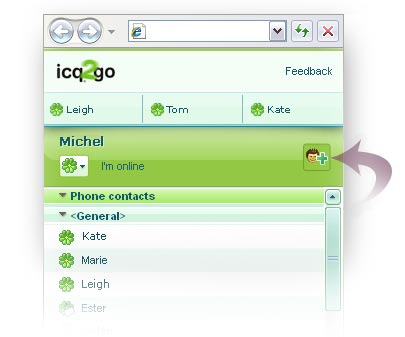 From the contact list, select the Add Contact button in the upper right corner next to your name. You can add either an AIM buddy (contact) or search for an ICQ contact to add by using the link below the input field.
