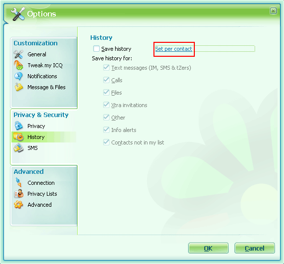 Don't save history pane, select the friend for which you want to save history and click the left pointing arrows button; The name now appears in the