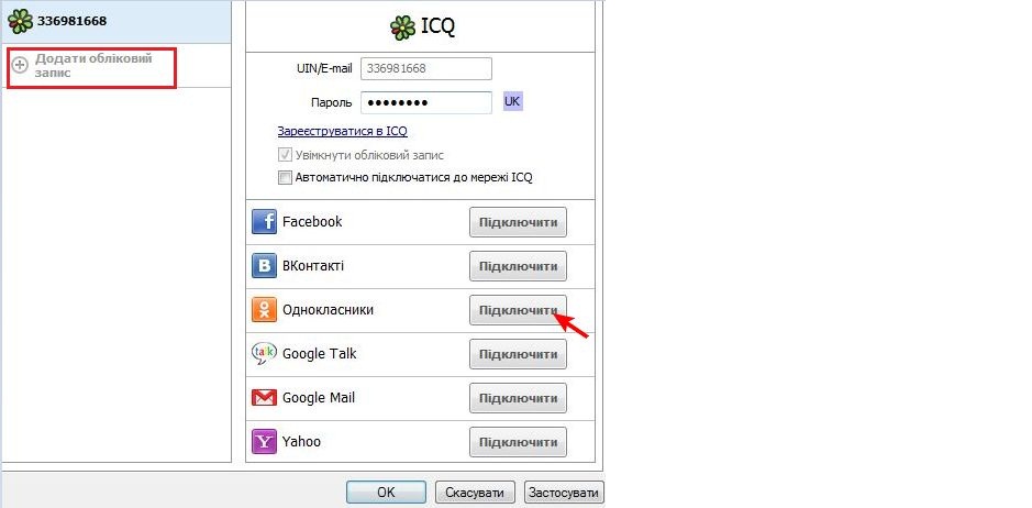 Додати ще один обліковий запис (ICQ, ВК, FB тощо)
