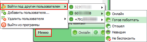 Для того чтобы зайти в ICQ под другим пользователем, перейдите «Меню» — «Войти под другим пользователем» и выберите под какой из ранее добавленных учетных записей и с каким статусом вы хотите зайти.
