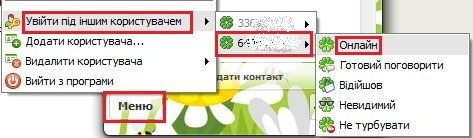 Щоб увійти до ICQ під іншим користувачем, перейдіть «Меню» — «Увійти від іншим користувачем» і виберіть, під яким з доданих раніше облікових записів і з яким статусом ви хочете увійти.