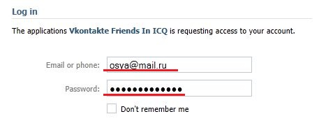 To start using ICQ to chat with your VKontakte friends, enter your username or email address linked to your online account, and the password you use to sign in to the service.