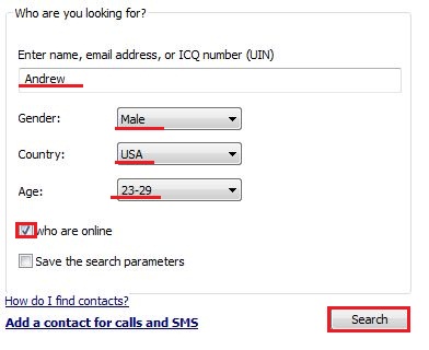If you don't know the user's UIN or email address or if you simply want to find a contact based on certain criteria, then enter the desired information in the appropriate fields and click "Search".