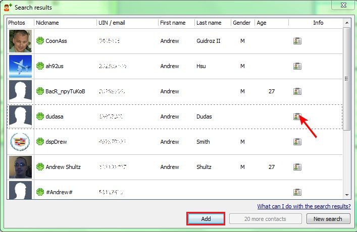 "Info" icon. To view the next 20 search results, click "20 more contacts".