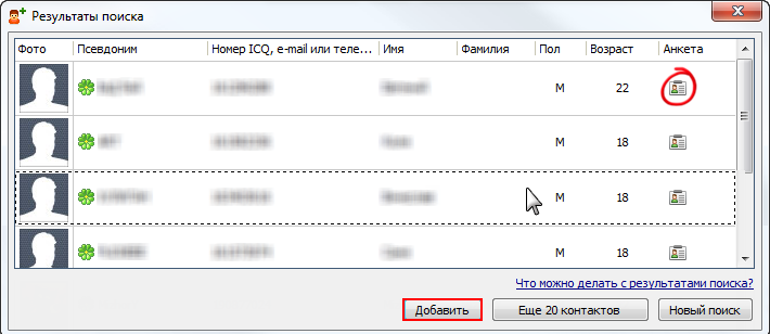 ICQ предложит вам список резултатов: