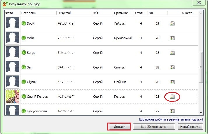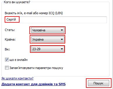 Якщо ви не знаєте UIN або точну e-mail адресу користувача або хочете просто знайти співрозмовника за певними критеріями, введіть потрібні дані в відповідні поля й натисніть «Пошук».