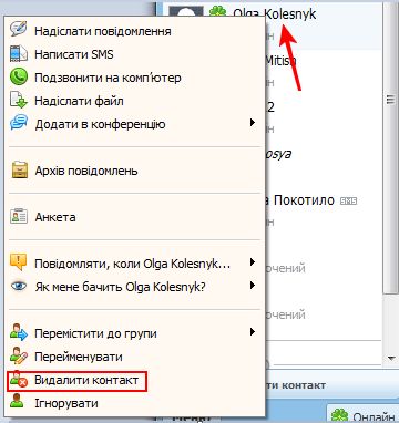 Щоб видалити контакт, натисніть на його ім'я правою кнопкою миші та виберіть «Видалити контакт».