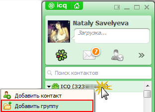 По умолчанию, в ICQ8 содержится 3 стандартные группы: «Родные», «Коллеги» и «Друзья», но вы можете создавать и свои собственные группы. Для этого кликните правой кнопкой мыши на имя вашей учетной записи в списке контактов и выберите «Добавить группу».