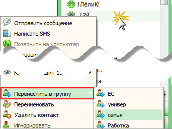Вы также можете просто перетащить контакт в группу. Для этого кликните на имени контакта левой кнопкой мыши, и, удерживая кнопку нажатой, перетащите контакт на название необходимой группы.