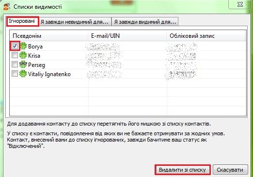 Якщо ви більше не хочете спілкуватися з певним користувачем, отримувати від нього повідомлення, бачити його в своєму списку контактів, а також хочете завжди бути невидимим для цього користувача, вам треба внести його до списку «Ігнорованих».