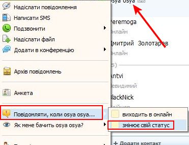 Крім загальних сповіщень, які налаштовуються для всіх ваших співрозмовників зі списку контактів, ви можете задати персональні налаштування для кожного контакту. Для цього клікніть правою кнопкою миші на ім'я контакту, а в спливному меню виберіть «Сповіщати, коли...» та поставте галочки навпроти тих подій, про які ви хочете дізнаватися.