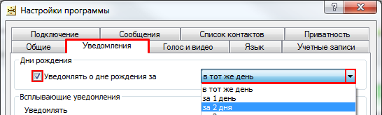 Вы также можете указать, за какое время до Дня Рождения присылать вам уведомления, для этого в выпадающем списке выберите необходимый параметр.
