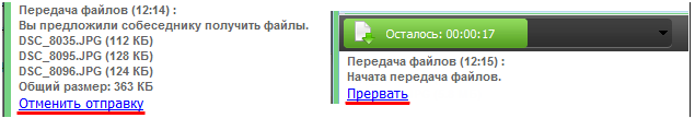 Пока собеседник не согласился принять файл, вы можете отменить передачу. Для этого кликните по ссылке «Отменить отправку». А во время передачи файлов, для ее отмены, кликните по ссылке «Прервать».