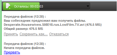 Если вы решили принять файл, то сразу после вашего согласия начнется автоматический прием файлов. Во время передачи вы можете отказаться, для этого кликните по ссылке «Прервать», над сообщением об отправке отображается время, оставшееся до полной передачи файла.