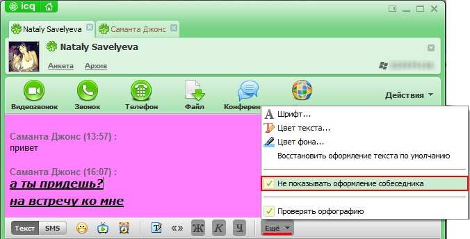 Если ваш собеседник решил отказаться от стандартного стиля отображения сообщений (цвет фона, размер и цвет шрифта и т.п.), и выбрал подходящий для него – то данные настройки будут отображаться и у вас. Но вы можете отключить их, для этого нажмите «Ещё» и выберите «Не показывать оформление от собеседника».