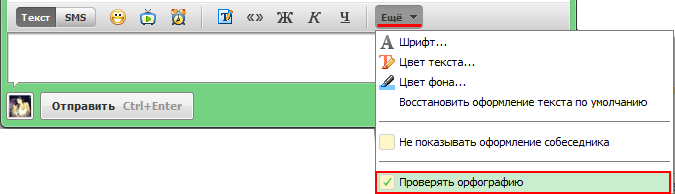Прежде чем отправить сообщение, всегда будет полезно проверить орфографию написанного, чтобы избежать досадных опечаток. Для того чтобы всегда проверять текст отправляемых сообщений, в окне диалога нажмите «Еще» и выберите «Проверять орфографию».
