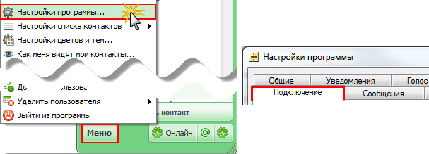 Для того чтобы изменить настройки подключения программы ICQ перейдите «Меню» — «Настройки программы» и выберите вкладку «Подключение».