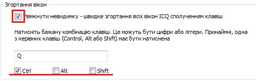 Тепер треба вказати — при натисненні на яку комбінацію клавіш вікна ICQ згортатимуться. У комбінації необхідно задіяти хоча б одну з керівних кнопок «Ctrl», «Alt» або «Shift».