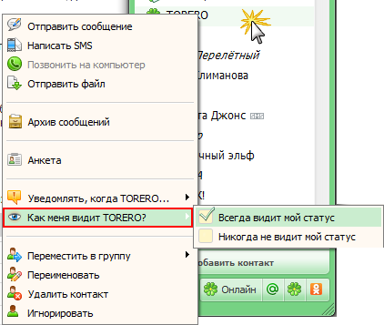 Чтобы добавить пользователя в список необходимо нажать на имя контакта правой кнопкой мыши и в появившемся меню выбрать «Как меня видит ...» — «Всегда видит мой статус…» или «Никогда не видит мой статус».
