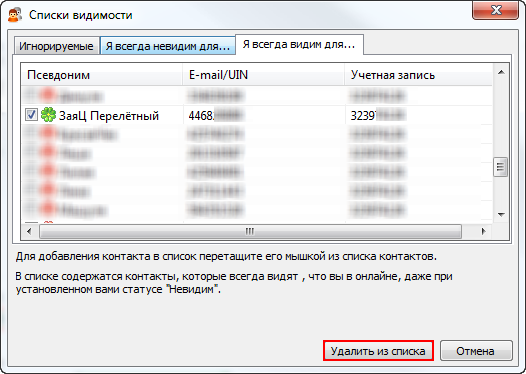Чтобы удалить контакт из списка установите галочку напротив контакта, который хотите убрать, и нажмите «Удалить из списка» или же кликните на имя контакта правой кнопкой мыши, в появившемся окне выберите «Как меня видит...» и снимите галочку напротив необходимого поля.