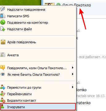 Якщо ви не хочете більше спілкуватися з якимось користувачем, отримувати від нього повідомлення, бачити його в своєму списку контактів і хочете завжди бути невидимим для цього користувача, вам необхідно внести його до списку «Ігнорованих». Для цього клікніть на ім'я контакту правою кнопкою миші, а в меню, що з'явилося, оберіть «Ігнорувати».