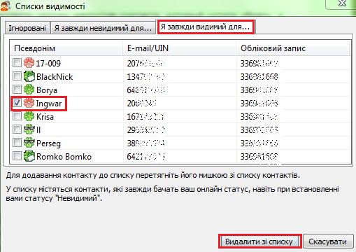 Щоб видалити контакт зі списку, поставте галочку навпроти контакту, який хочете прибрати, й натисніть «Видалити зі списку» або ж клікніть на ім'я контакту правою кнопкою миші, а в вікні, що з\'явилося, виберіть «Як мене бачить...» і зніміть галочку навпроти потрібного поля.