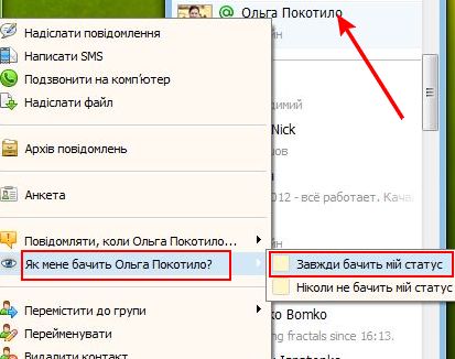 Щоб додати користувача у список, потрібно натиснути на ім'я контакту правою кнопкою миші, а в меню, що з\'явилося, вибрати «Як мене бачить...» — «Завжди бачить мій статус…» або «Ніколи не бачить мій статус».