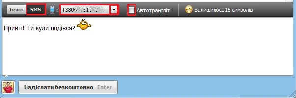 Ви можете увімкнути автотранслітерацію тексту, тоді ви набиратимете повідомлення українською, а користувач отримає його на трансліті. Щоб транслітерувати текст перед надсиланням, поставте галочку навпроти «Автотрансліт».