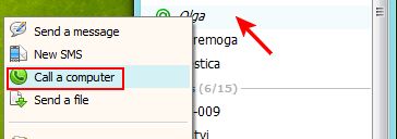To call a contact's computer, right-click on his or her name in the contact list, and in the menu select "Call a computer". You can also make a call from the conversation window by clicking "Call".