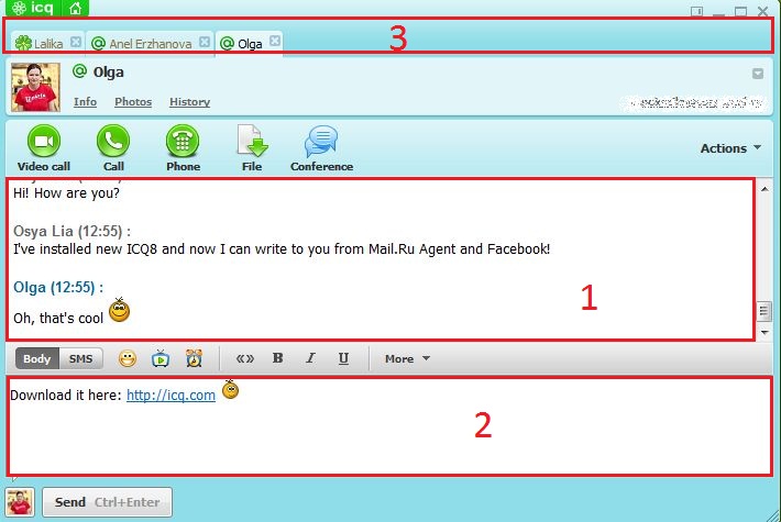 — the field where you write your messages before sending them to your conversation partner. In addition to using the standard font and color, you can choose your own. You can also use emoticons and toons in your messages.
