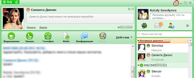 Если у вас включен режим объединенных окон, то к диалоговому окну будет присоединен список контактов, что поможет вам быстрее переходить к диалогу с новыми пользователями. Все собеседники, с которыми вы ведете диалог в текущий момент, будут собраны над общим списком контактов в разделе «Активные диалоги». Чтобы переключаться от одного диалога к другому, кликайте на имя необходимого контакта в списке.